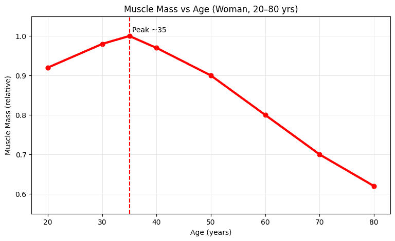 女性肌肉量大約在20~30歲:肌肉量與肌力最巔峰(最佳狀態)。在30-35歲後:開始緩慢下降(如果沒有規律阻力訓練會更明顯)。於40歲後:下降速度更明顯。更年期前後(約45~55歲):肌肉流失與脂肪增加常會「加速」。(圖2)