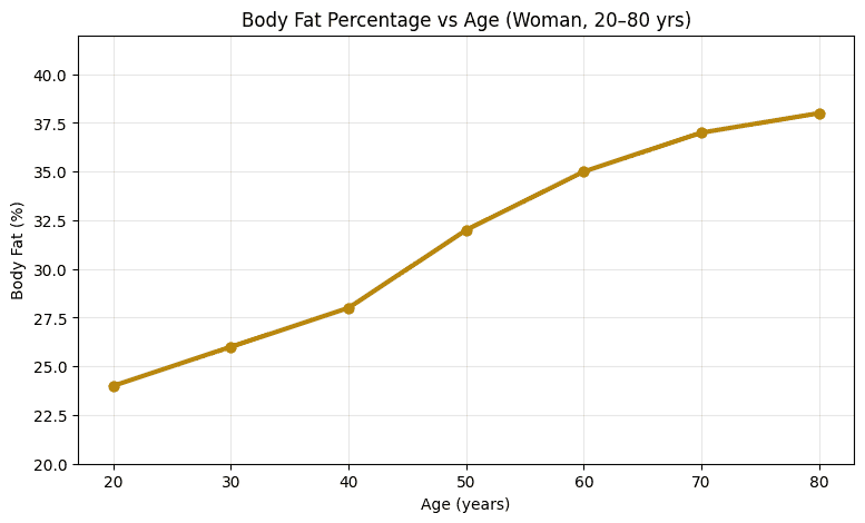 女性的體脂肪比例,在40歲過後,體脂率開始逐漸上升,常與肌肉量下降、活動量減少有關。更年期前後(約45~55歲):體脂增加速度常變快,脂肪更容易集中在腹部與內臟。60歲以上,即使體重變化不大,因瘦體重持續流失,體脂率仍可能繼續上升。(圖3)