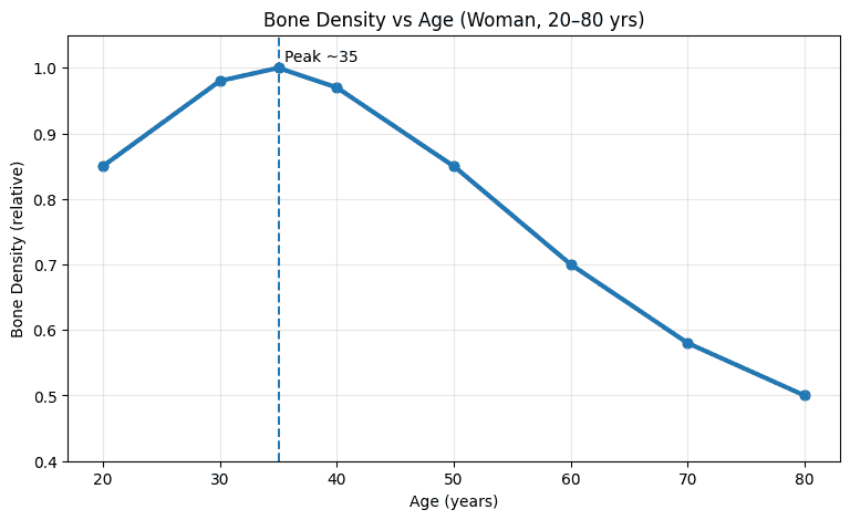 女性一生的骨質密度,大約在35歲達到高峰,之後每年大約流失1% 的骨質。而進入更年期之後,前十年大約每年流失2-3%。更年期的骨質流失是非常常見、而且「速度會突然變快」的一段時期,核心原因是雌激素下降,讓骨骼的「分解速度 > 生成速度」,因此骨密度快速下降,骨折風險上升。(圖1 )