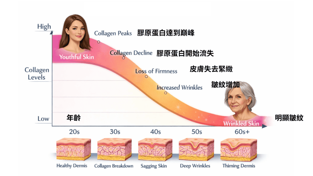 圖4. 女性的膠原蛋白在20-30歲處於巔峰狀態。進入30歲後,膠原蛋白生成逐漸下降。40歲時流失更明顯,皮膚支撐力變弱,乾燥、鬆弛與紋路加深會逐漸出現。